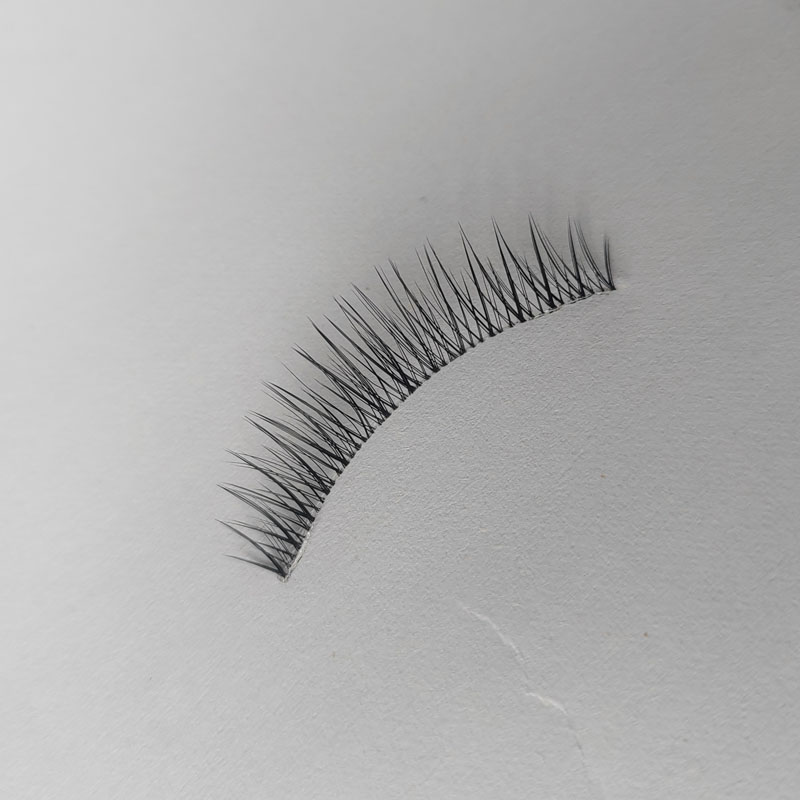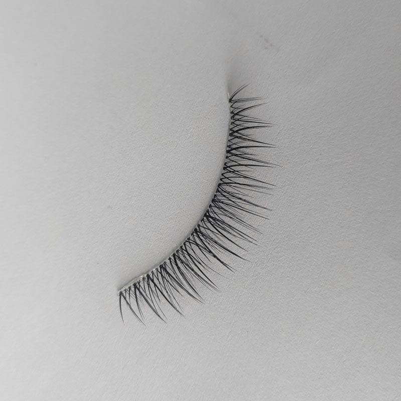 Wimpern aus synthetischem Haar. Diese Art von falschen Wimpern, sehr dünner transparenter Stiel, natürliche Länge, nicht auffällig, angenehm zu tragen, weicher, wilder C-Curl, dicker Curl ist immer noch leicht und luftig.